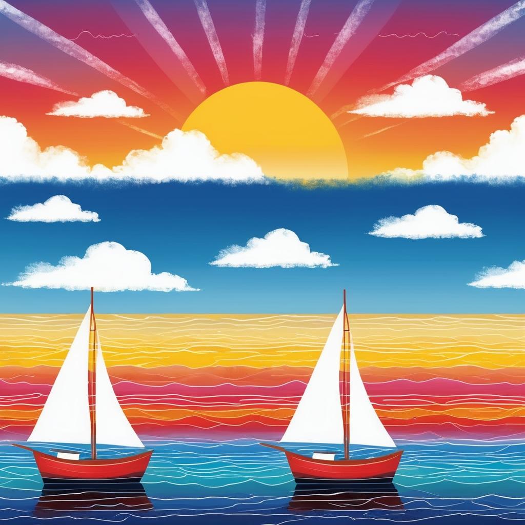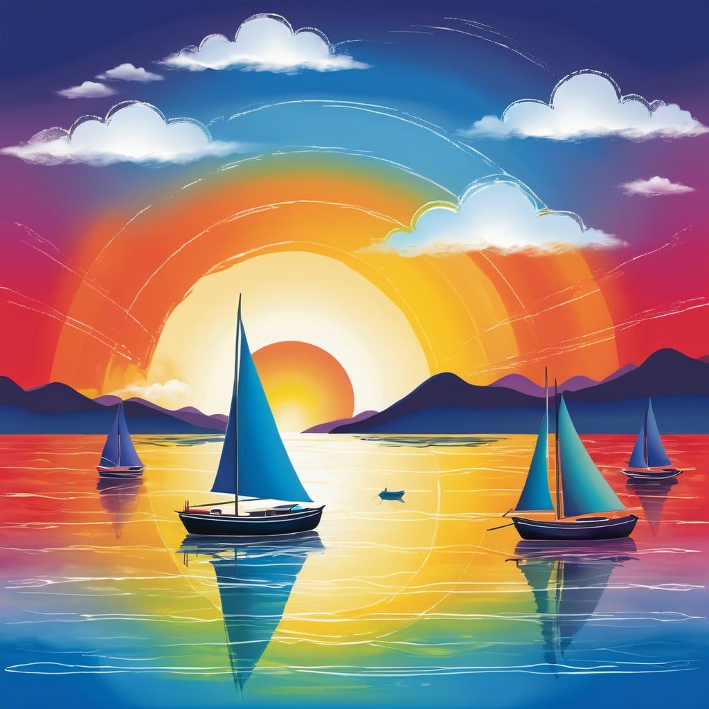 这幅作品以其简洁的线条和大胆的色彩选择吸引人。它给人一种自由和无拘束的感觉,似乎在捕捉一个快乐无忧的时刻。为了提升这幅作品,可以考虑增加一些细节,比如在帆船上添加更多的纹理或在水面上加入波光粼粼的效果。这不仅能增加画面的深度,还能让观众更有代入感。此外,可以尝试在天空中加入更多的色彩渐变,增强日落或日出的效果,以增加情感共鸣。