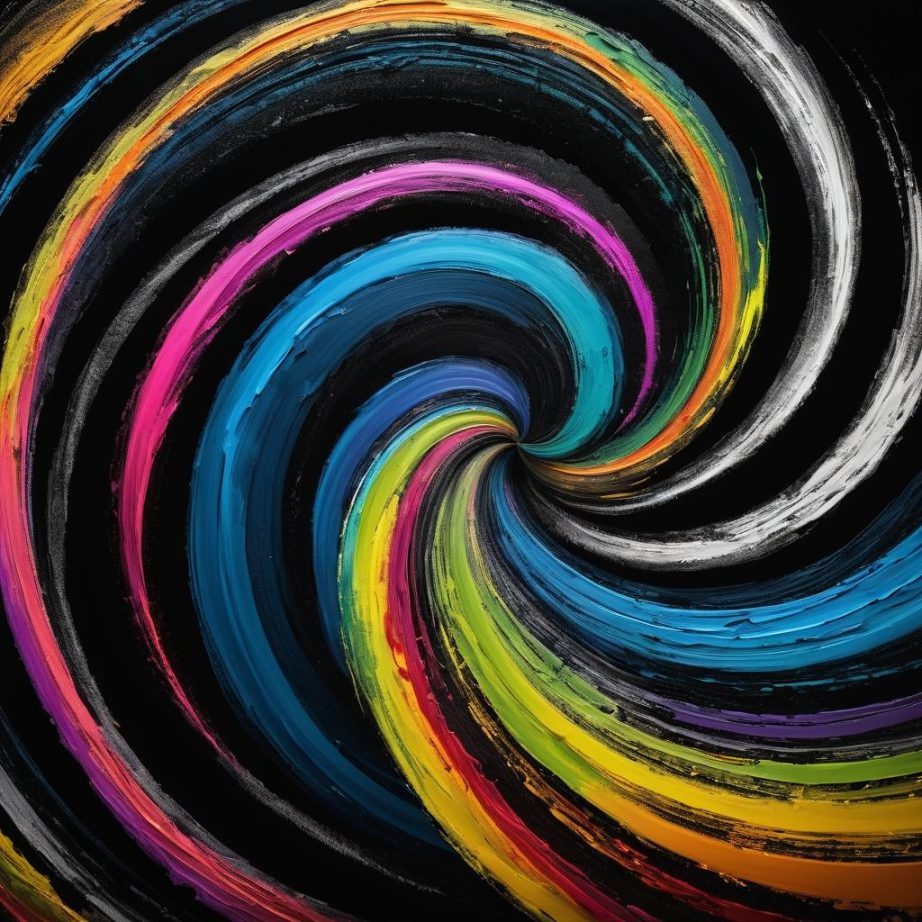 这幅作品使用了多种颜色的螺旋线条,在黑色背景上形成一种活泼而抽象的构图。色彩鲜艳,线条自由流动,表现出一种天真和即兴的情感。这可能是一种对自然、风的动态或者内心情感的抽象表达。