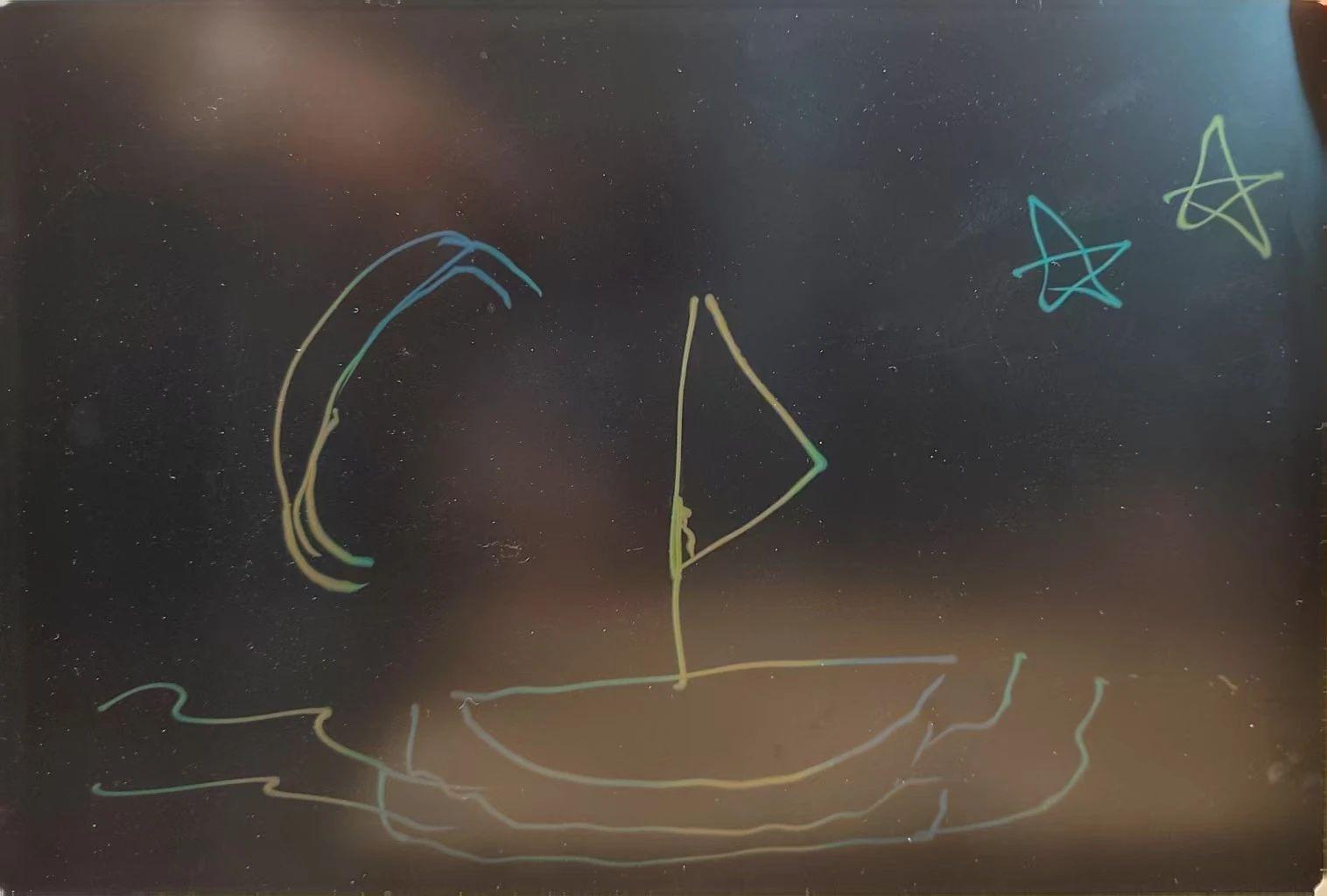 这幅作品使用了简单的线条和色彩,呈现了一艘小船漂浮在海面上的场景。天空中有两颗星星和一个弯曲的月亮,营造出一种宁静和梦幻的夜晚氛围。整体构图简约,富有儿童画的天真感和直观性。