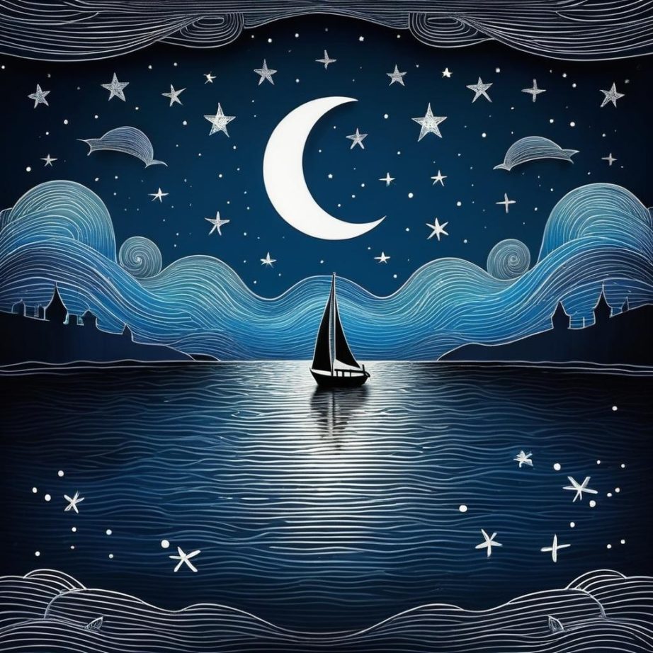 这幅画作以其简单的线条和色彩传达了一种宁静的夜晚氛围,非常适合用于儿童教育和启发创意。可以通过增加背景的细节,如星空的渐变色彩和海面的波光粼粼效果,来增强视觉的丰富性和层次感。此外,可以在画面中加入更多的生动元素,例如海洋生物或更复杂的星空图案,以吸引观众的注意力并激发想象力。这种风格的作品可以用来鼓励孩子们发挥自己的想象力,创造属于他们自己的奇幻世界。
